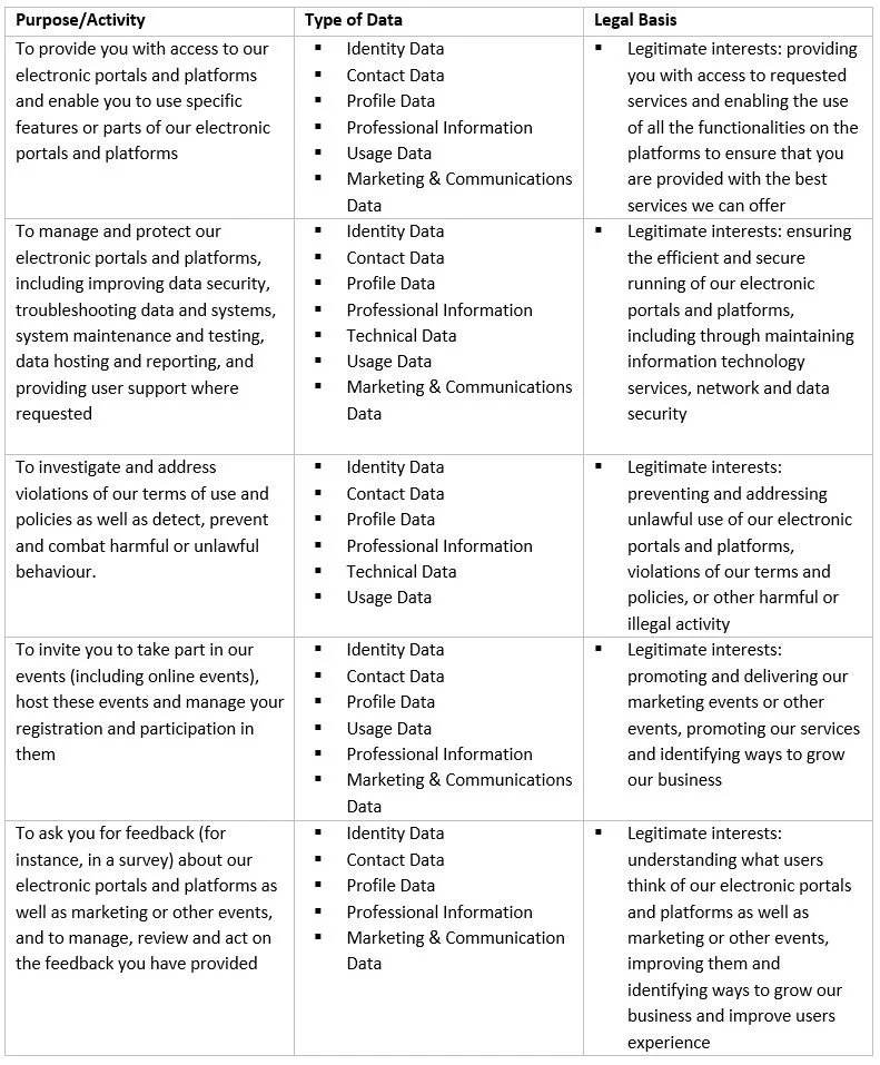 We are required to inform you of the purposes for which we use your personal data, the legal reasons for doing so and, if we rely on a so-called “legitimate interest” as a reason, to tell you what that legitimate interest is. A legitimate interest reason for using your data is one justified for a good business reason or a commercial purpose like marketing.